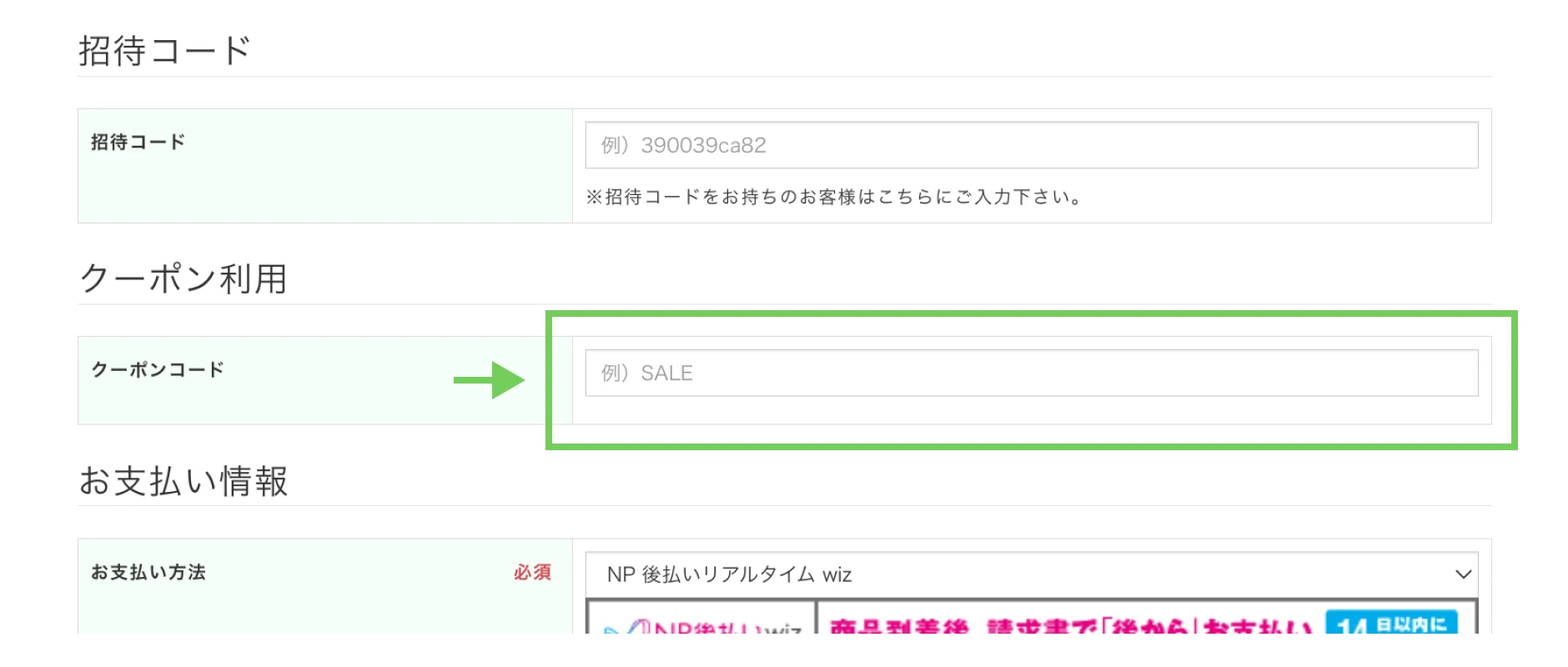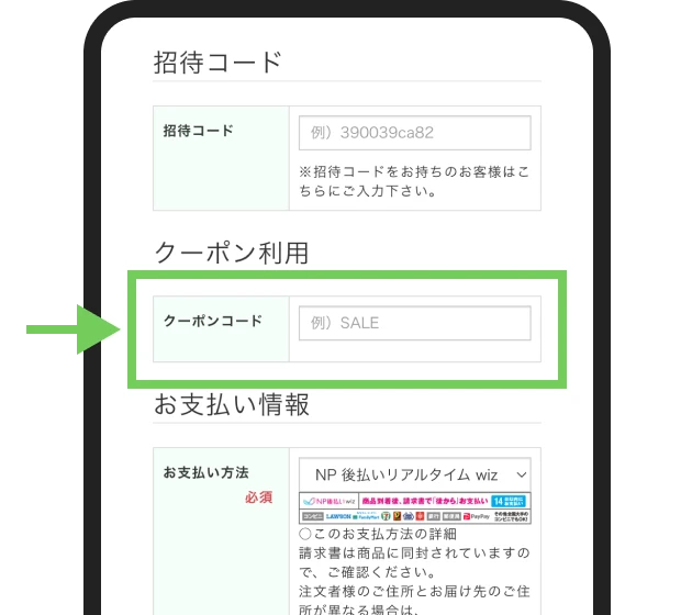 クーポンを使用する場合は、クーポンコード欄にコードを入力してください。