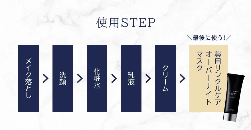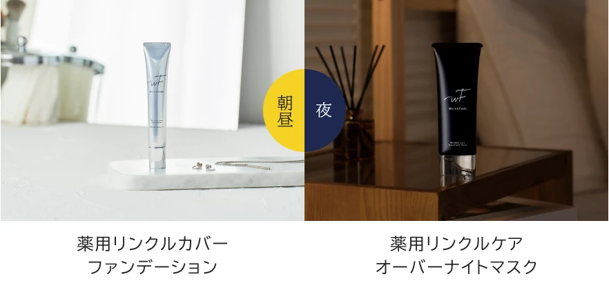 薬用リンクルカバーファンデーション、または薬用リンクルケアファンデーション(ハイカバー)と一緒にお使いいただくことで、日中は、カバーしながらシミ・シワにアプローチしてくれる【リンクルカバーファンデーション/リンクルケアファンデーション(ハイカバー)】、夜は、肌の揺らぎを整えながらシミ・シワにアプローチしてくれる【オーバーナイトマスク】で1日を通して【シワ改善】×【美白ケア】が可能になります。