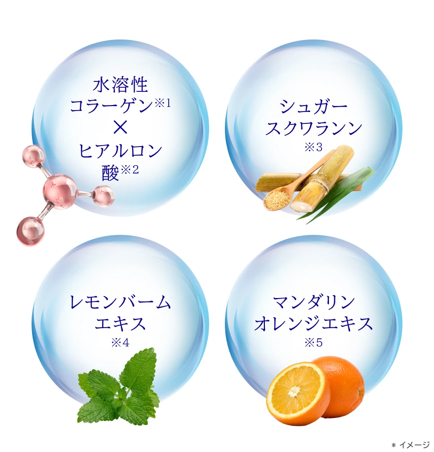 ナイアシンアミド*、グリチルリチン酸ジカリウム*、1,3-ブチレングリコール、アクリル酸・メタクリル酸アルキル共重合体、水酸化ナトリウム、 ジペンタエリトリット脂肪酸エステル(1)、2-エチルヘキサン酸セチル、リンゴ酸ジイソステアリル、N-ラウロイル-L-グルタミン酸ジ(フィトステリル・2-オクチルドデシル)、マカデミアナッツ油脂肪酸フィトステリル 、ジリノール酸ジ(フィトステリル/イソステアリル/セチル/ステアリル/ベヘニル)、天然ビタミンE、水素添加大豆リン脂質、シュガースクワラン、メチルポリシロキサン、無水ケイ酸、濃グリセリン、ポリグリセリン、1,2-ペンタンジオール、ジエチレントリアミン五酢酸五ナトリウム液、ヒアルロン酸ナトリウム(2)、水溶性コラーゲン液(3)、メリッサエキス、チンピエキス、クエン酸、クエン酸ナトリウム、フェノキシエタノール